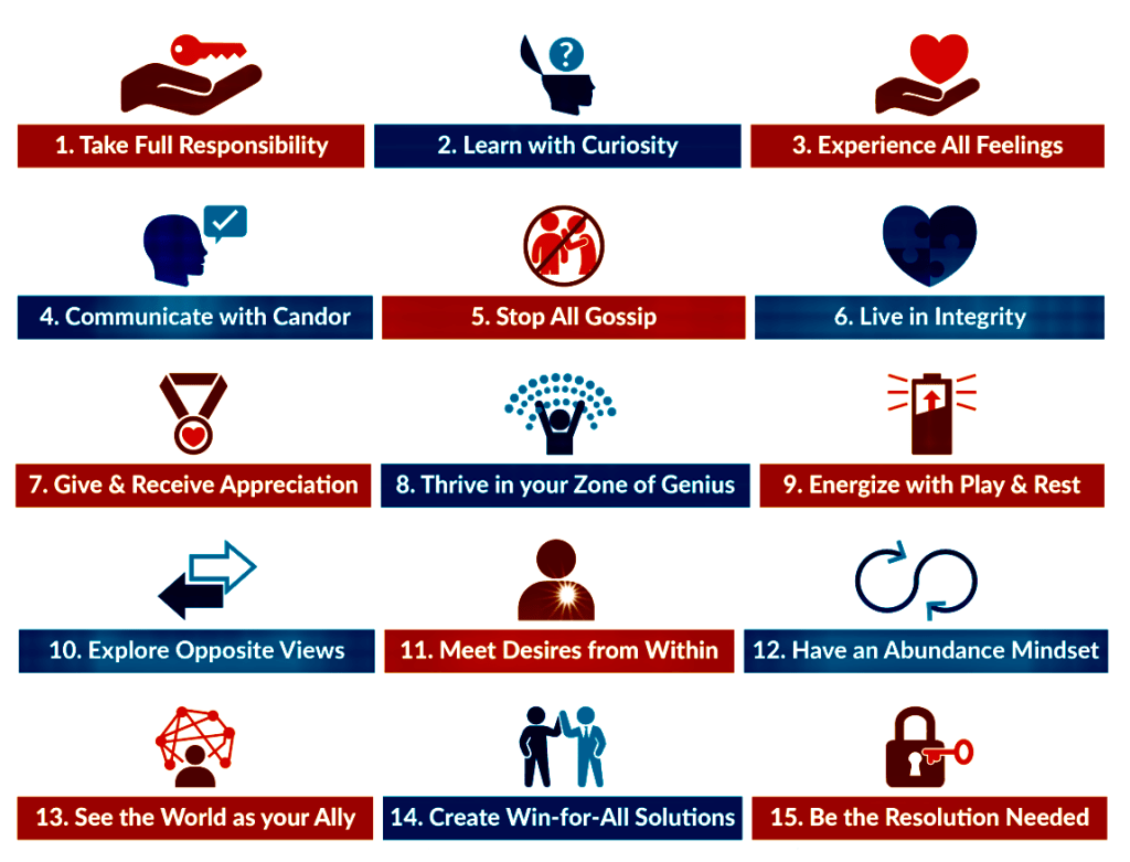 The central premise of the book entails 15 guidelines, or commitments, that emphasize ending drama (1-6), reinvesting that reclaimed energy (7-9), deeply understanding who we are (10-12), and how we relate to, and co-create with, the world (13-15).
