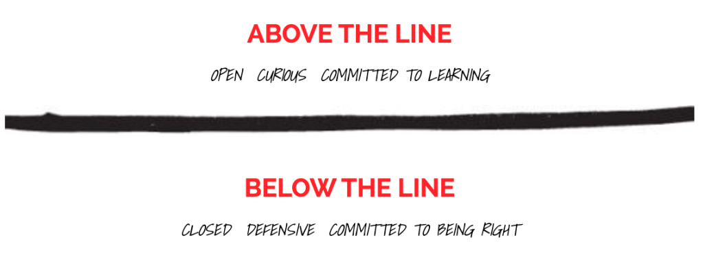 - Above the Line: “Although I know what works based on my past experience. I also recognize that my experience is only one of many, and that your different experience is just as valid. There isn’t necessarily a right or a wrong, only our interpretations. Let’s try it your way and see what we learn.”