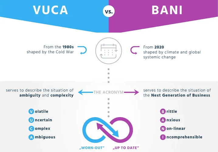 VUCA is all about what’s happening around you; how fast things are changing, how uncertain the outcomes are, how complex systems can get, and how unclear situations can be. BANI, on the other hand, is the replacement framework that focuses on the psychological toll of those situations: brittleness replaces volatility, anxiousness replaces uncertainty, non-linear replaces complexity, and incomprehensibility replaces ambiguity.
